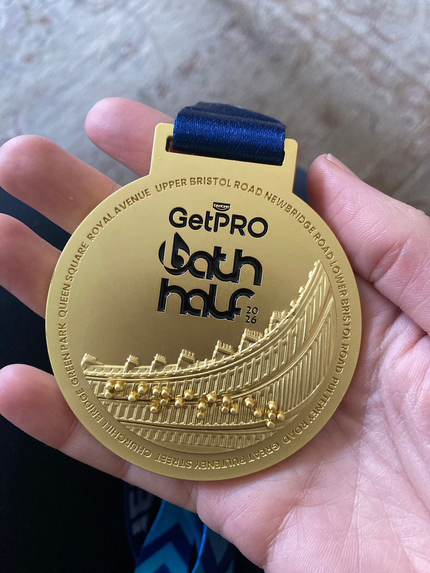 My medal says “finisher” in braille. He told me so, he worked it out, he learned a bit of braille in one of his first jobs. It doesn’t say it anywhere else on the medal itself, only on the ribbon, which feels really special for the blind runners in the race. I now know what “finisher” feels like in braille.